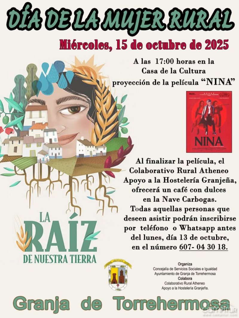El próximo miércoles, 15 de octubre de 2025, Granja de Torrehermosa rendirá homenaje a las mujeres rurales con una jornada muy especial en la Casa de la Cultura, donde a las 17:00 horas se proyectará la película “NINA”, un intenso thriller rural que narra la historia de una mujer que lucha por la justicia y la venganza en un entorno marcado por las tradiciones del campo.